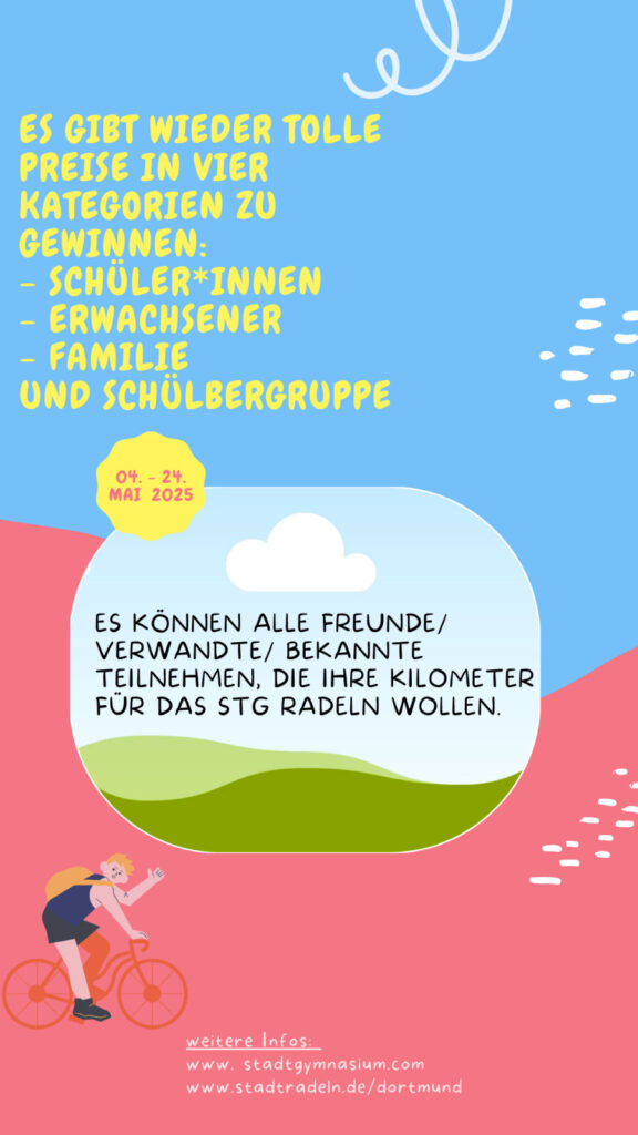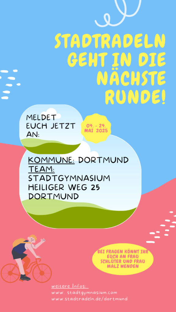 Alles was ihr/Sie dafür tun müsst/müssen, ist kräftig in die Pedalen treten und die Kilometer mithilfe der App (STADTRADELN oder Bike Citizens) oder online (www.stadtradeln.de) für das Stadtgymnasium Dortmund eintragen. (→ Kommune: Dortmund, Team: Stadtgymnasium Heiliger Weg 25 Dortmund)