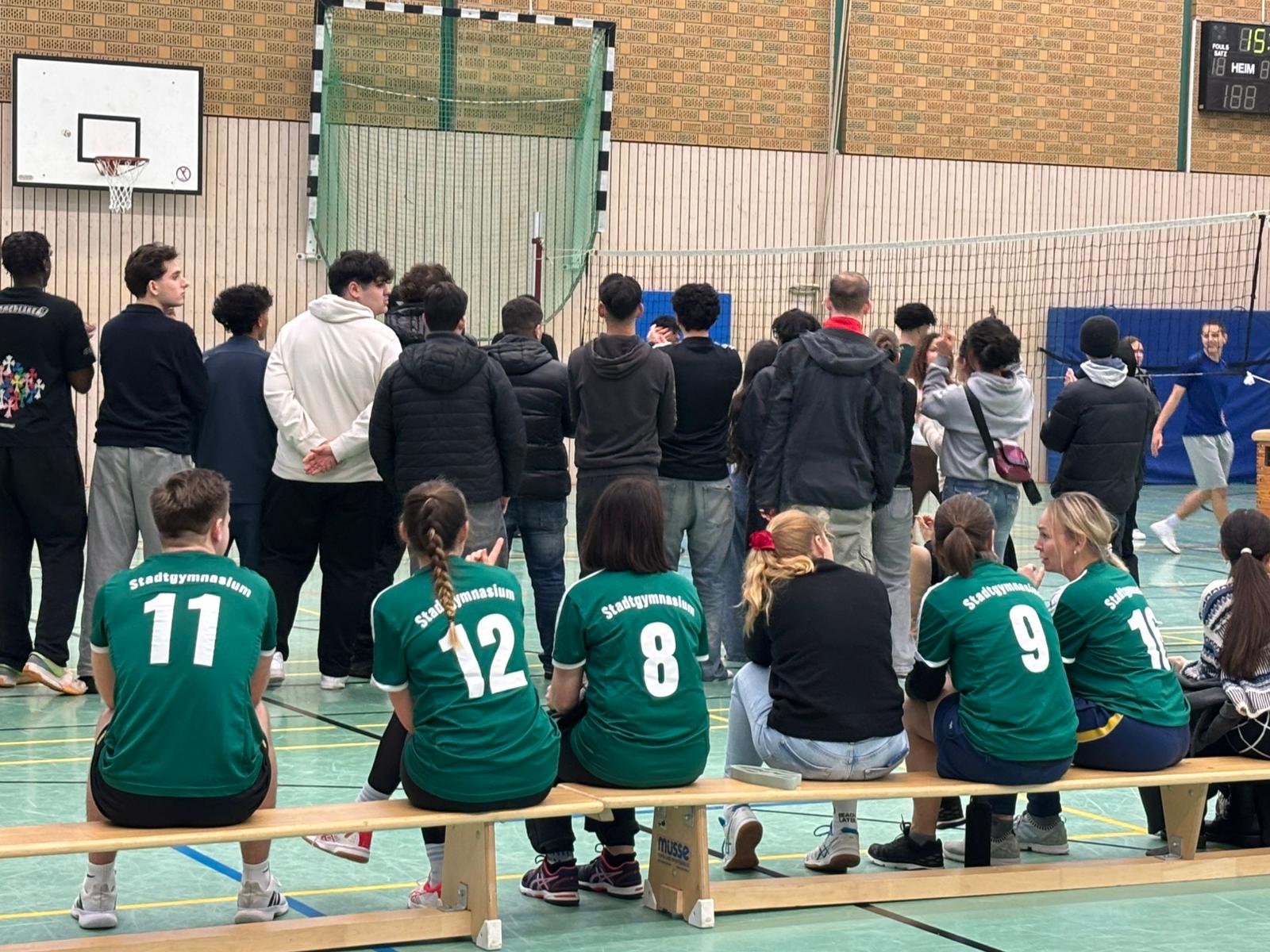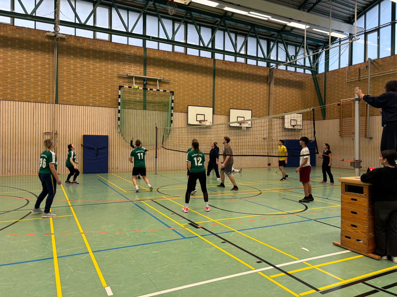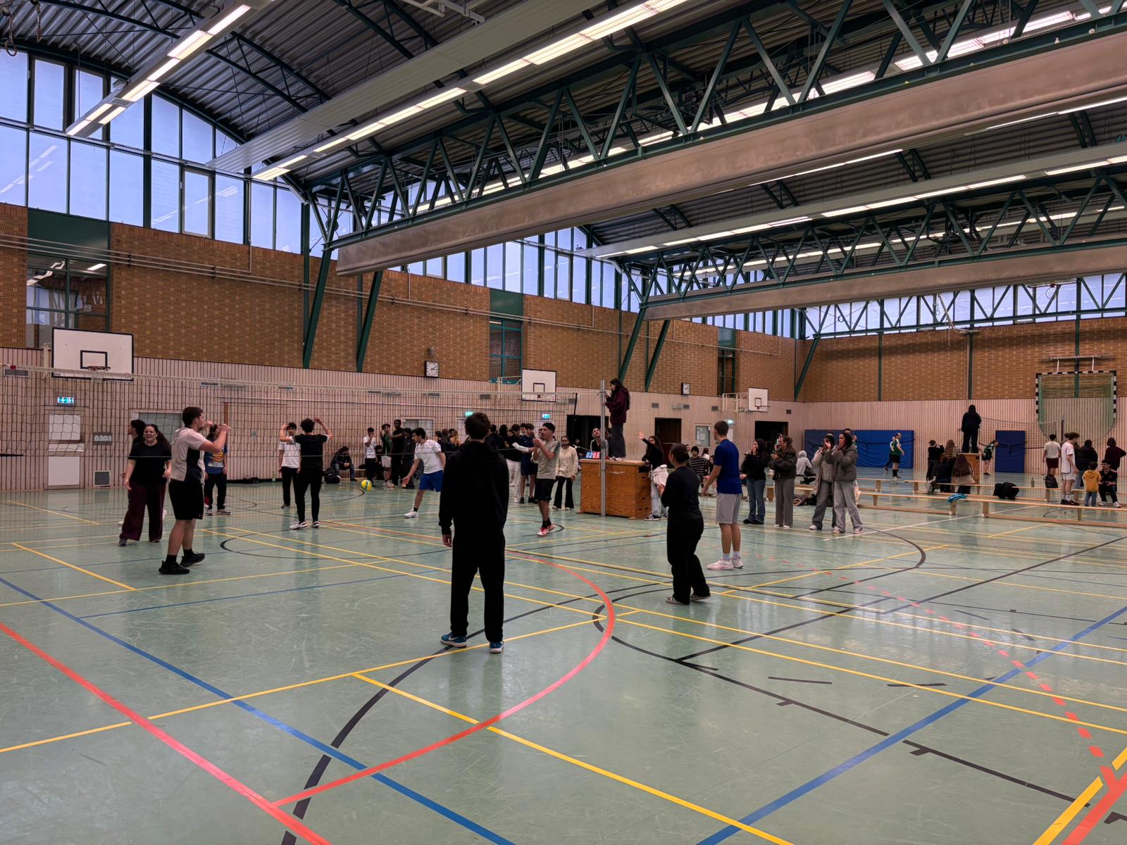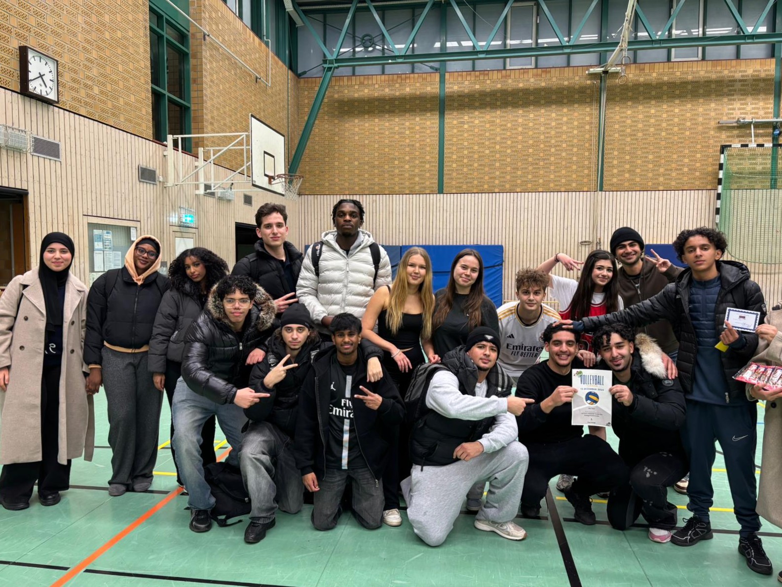 Am 12.12. fand in unserer Sporthalle wieder das Oberstufen-Volleyballturnier statt. Auch bei der dritten Auflage traten Lehrerinnen und Lehrer sowie Schülerinnen und Schüler aus der EF, Q1 und Q2 gegeneinander an. Neu in diesem Jahr war, dass sich erfreulicherweise auch Ehemalige angemeldet haben. Die Teams sorgten für tolle Spielzüge, spannende Spiele und eine großartige Stimmung in der Halle. Am Ende setzte sich das Team Hoeschpark SC durch und wurde mit Weihnachtsschokolade und einem Gutschein bei Ayman’s in Dortmund belohnt.